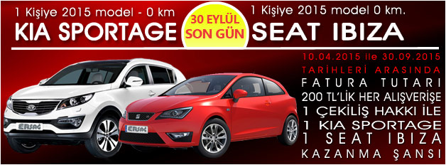 www.ersag.com.tr sıfır kilometre otomobil kazandırıyor 2015 Model Oto Kampanyaları, Ersağ Ağustos Ayı Promosyonu, Ersağ Haziran Ayı Promosyonu, Ersağ Mayıs Ayı Promosyonu, Ersağ Temmuz Ayı PromosyonuMilli Piyango İdaresi Genel Müdürlüğü 27-03-2015 tarih ve 58259698 - 255.01.02 / 885-2141 sayılı izni ile, çekilişle “1 Adet Seat İbiza 1,4 85HP Reference 2015 Model ve 1 Adet KIA Sportage 1,6 GSL Comfort MT 135PS 2015 Model” Araba Kampanyası vardır.